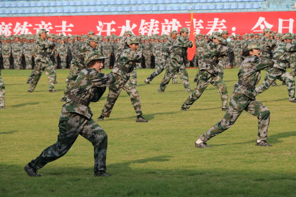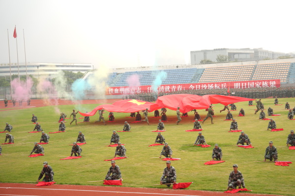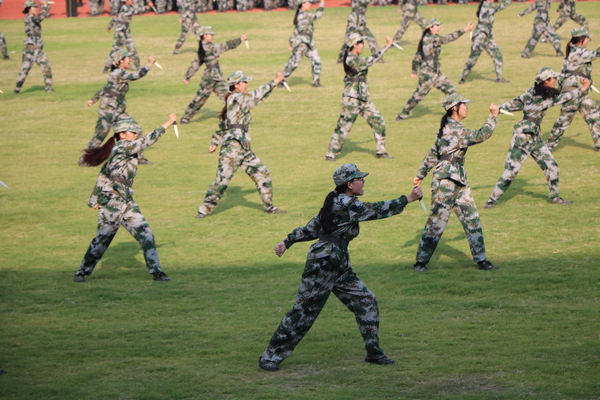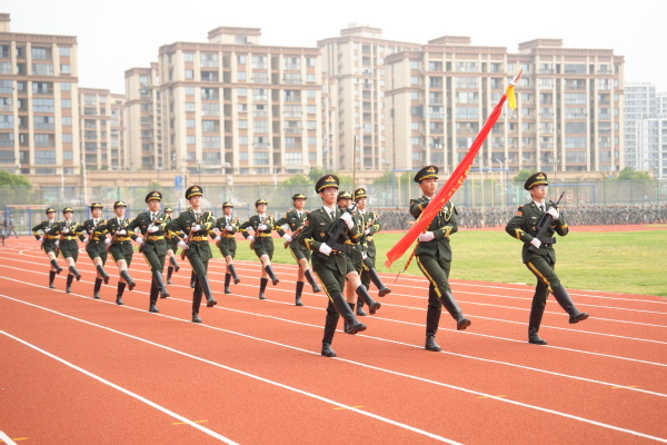 伴随着激昂的旋律,旗操方阵、匕首操方阵、军体拳方阵依次登场。他们动作整齐、气势如虹,一招一式尽显军人风范,展现了行知学子坚韧不拔的精神风貌。