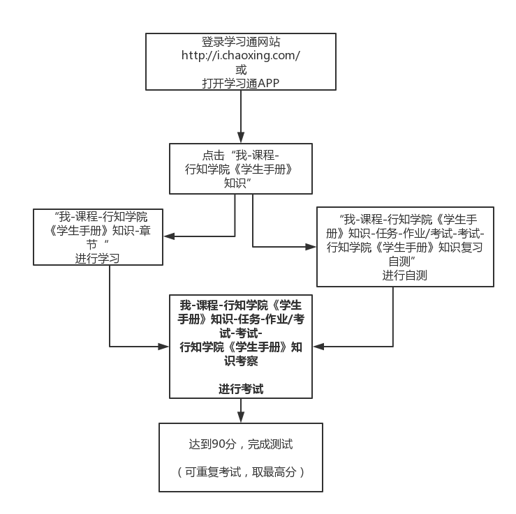 2. 学生登录后须先进入“我-课程-行知学院《学生手册》知识-章节”模块,对《学生手册》的各条款进行系统地学习,也可在“我-课程-行知学院《学生手册》知识-任务-作业/考试-考试”中选择“行知学院《学生手册》知识复习自测”对《学生手册》知识题库进行“在线练习”;